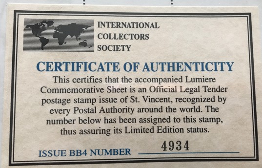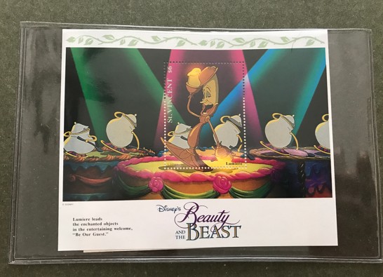 Disney’s Beauty and the Beast Stamp: Luminere singing “Be our Guest”, $6.00. Issued 1993 by St. Vincent. International Collectors Society. Limited Edition Certificate of Authenticity, Issue BB4 Number 4934. Mint condition; has never been out of the protective sleeve.