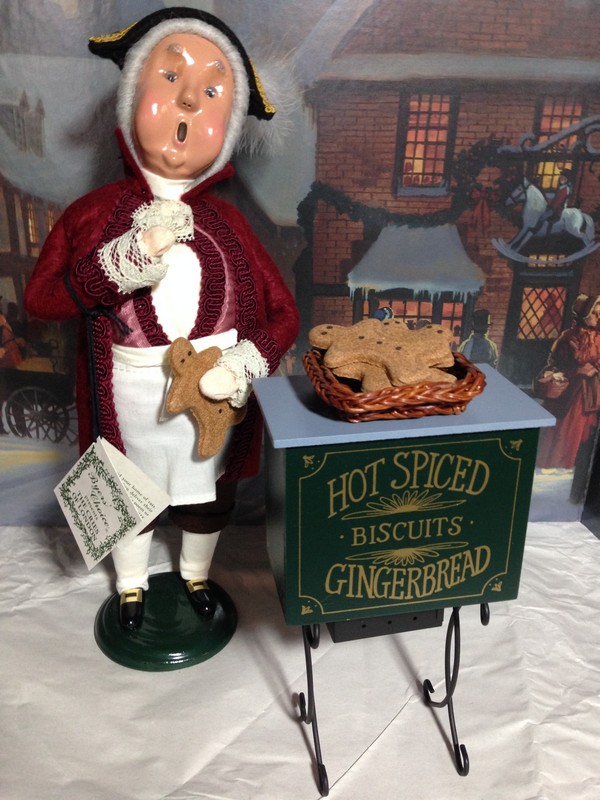 Byers’ Choice Gingerbread Vendor with Oven, 1996, Retired. With original Cries of London series tag. Stands 13″ tall. Separate oven standing 8″ tall reads, ‘Hot Spiced Gingerbread Biscuits’. Pre-owned, non-smoking home; perfect condition.