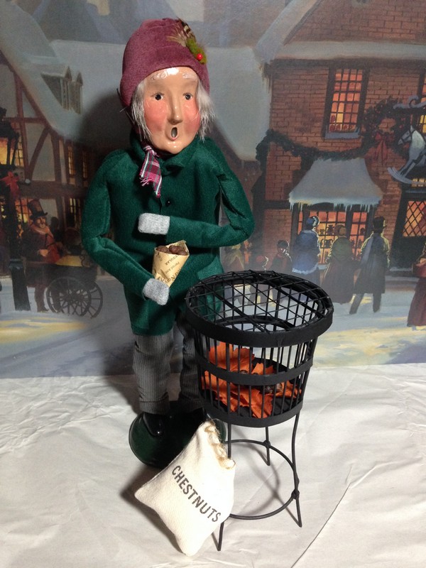 Byers’ Choice Man Roasting Chestnuts Set, 1993. Stands 12″ tall. Man in green coat holding bag of roasted chestnuts with a separate 6 1/2″ firepit and burlap bag for raw chestnuts. Pre-owned, non-smoking home; perfect condition.