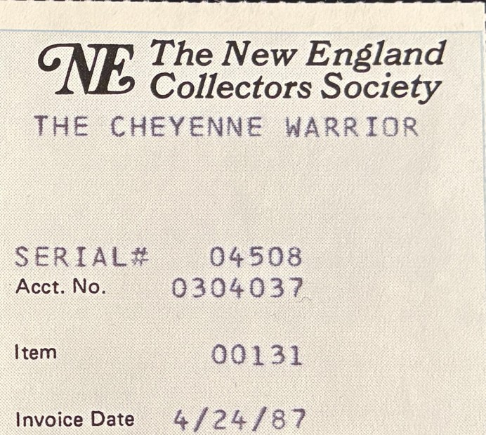 Frederic Remington ‘The Cheyenne’ bronze statue (1987), 8″ tall, 3.4 lbs. Includes both weapons; rare. Numbered limited edition, #4508 of 9500, plate on bottom of base. New England Collectors Society Reproduction.