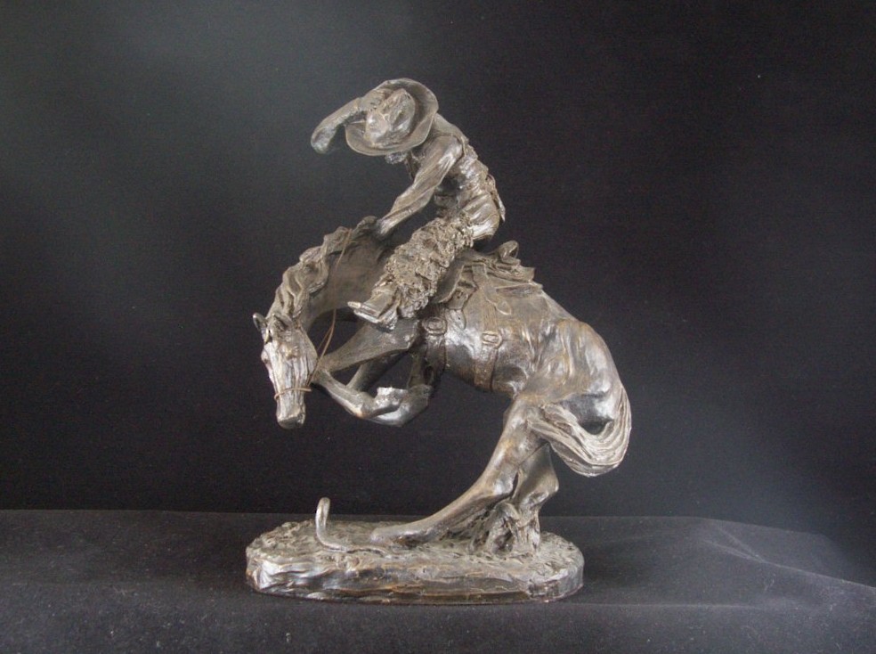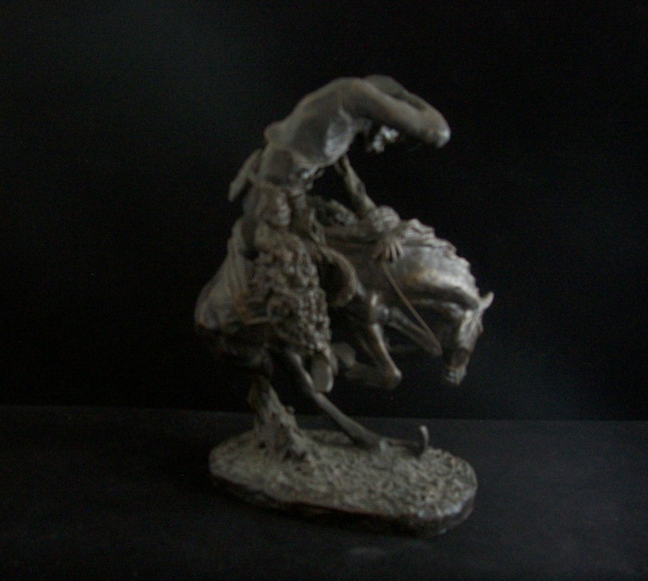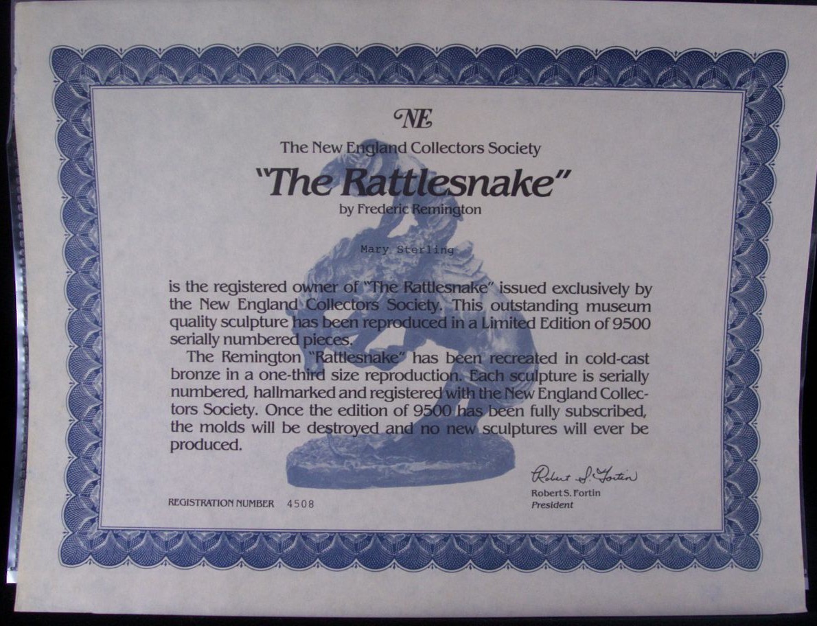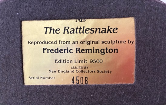 Frederic Remington ‘Rattlesnake’ bronze statue, 8″ tall, 2.4 lbs. Numbered limited edition, #4508 of 9500, plate on bottom of base. New England Collectors Society Reproduction with certificate of authenticity.